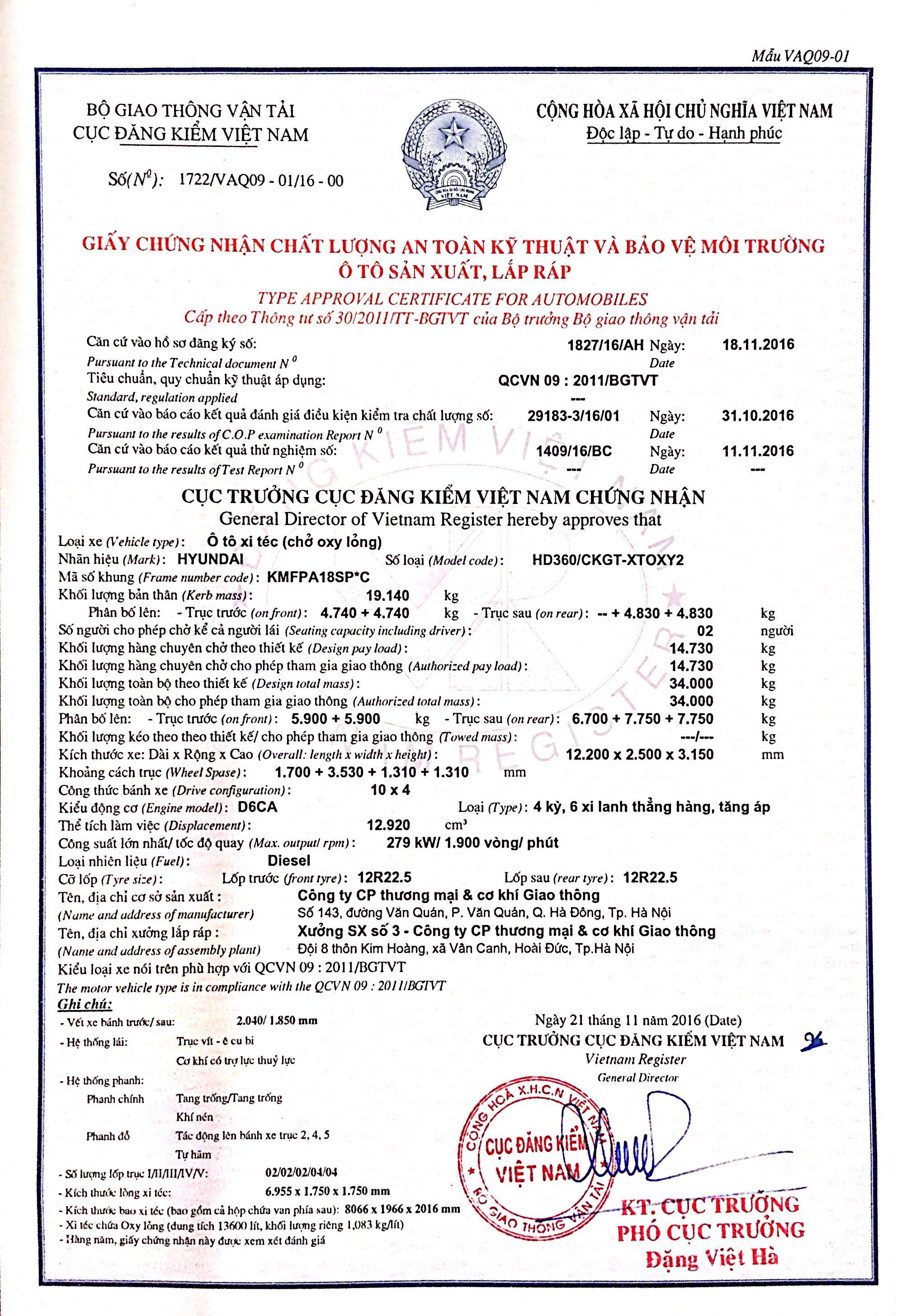 Ô tô xi téc chở ô xy lỏng HYUNDAI HD320/CKGT-XTOXY2 chất lượng tốt, kết cấu vững chắc, tiết kiệm nhiên liệu,...