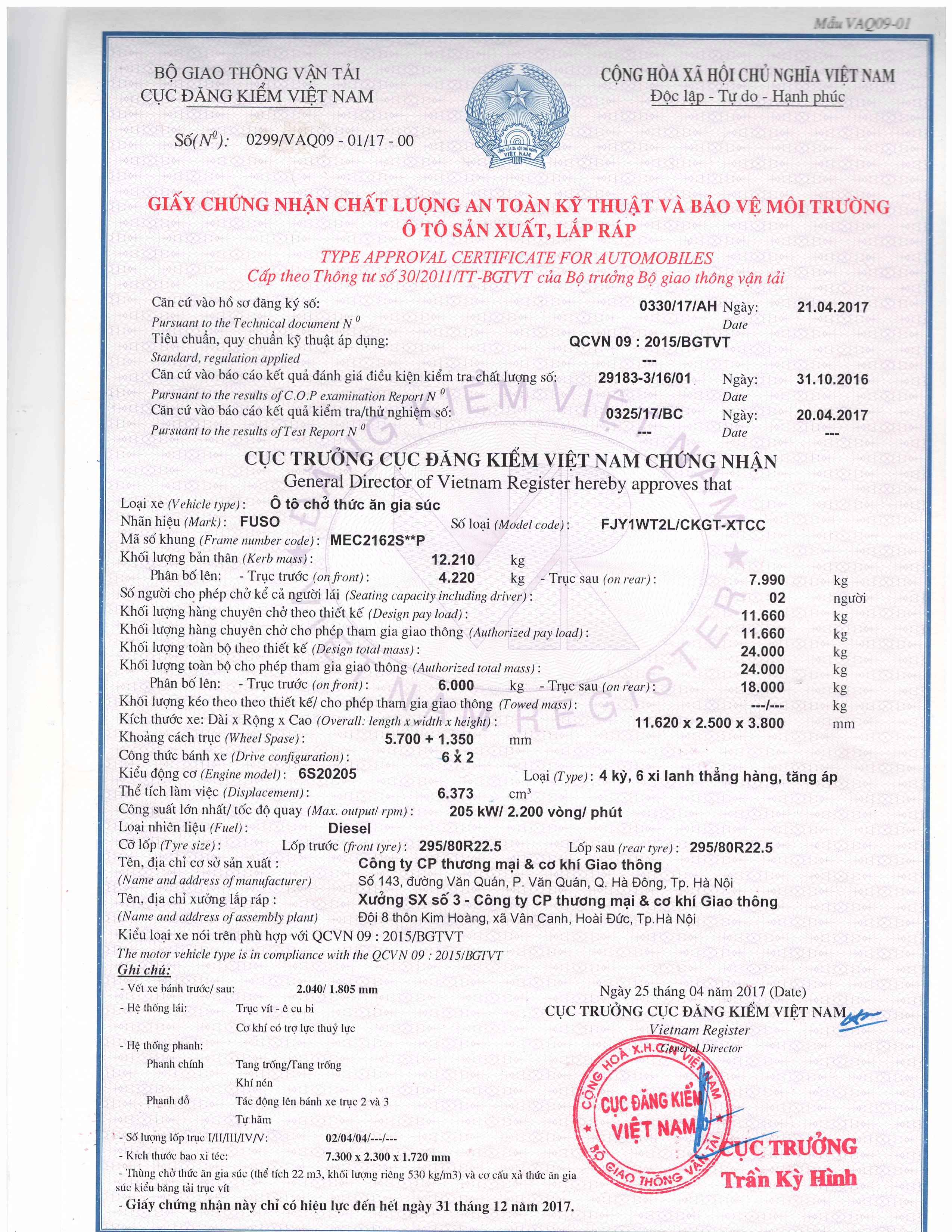 TT Nội dung Trị số 1 Thông tin chung 1.1 Loại phương tiện Ô tô xitéc (chở thức ăn gia súc) 1.2 Nhãn hiệu, số loại của phương tiện FUSO FJY1WT2L/CKGT-XTCC 1.3 Công thức bánh xe 6x2 2 Thông số về kích thước 2.1 Kích thước bao : Dài x Rộng x Cao (mm) 11620x2500x3800 2.2 Chiều dài cơ sở (mm) 5700+3800 3 Thông số về khối lượng 3.1 Khối lượng bản thân (kg) 12210 3.2 Khối lượng...