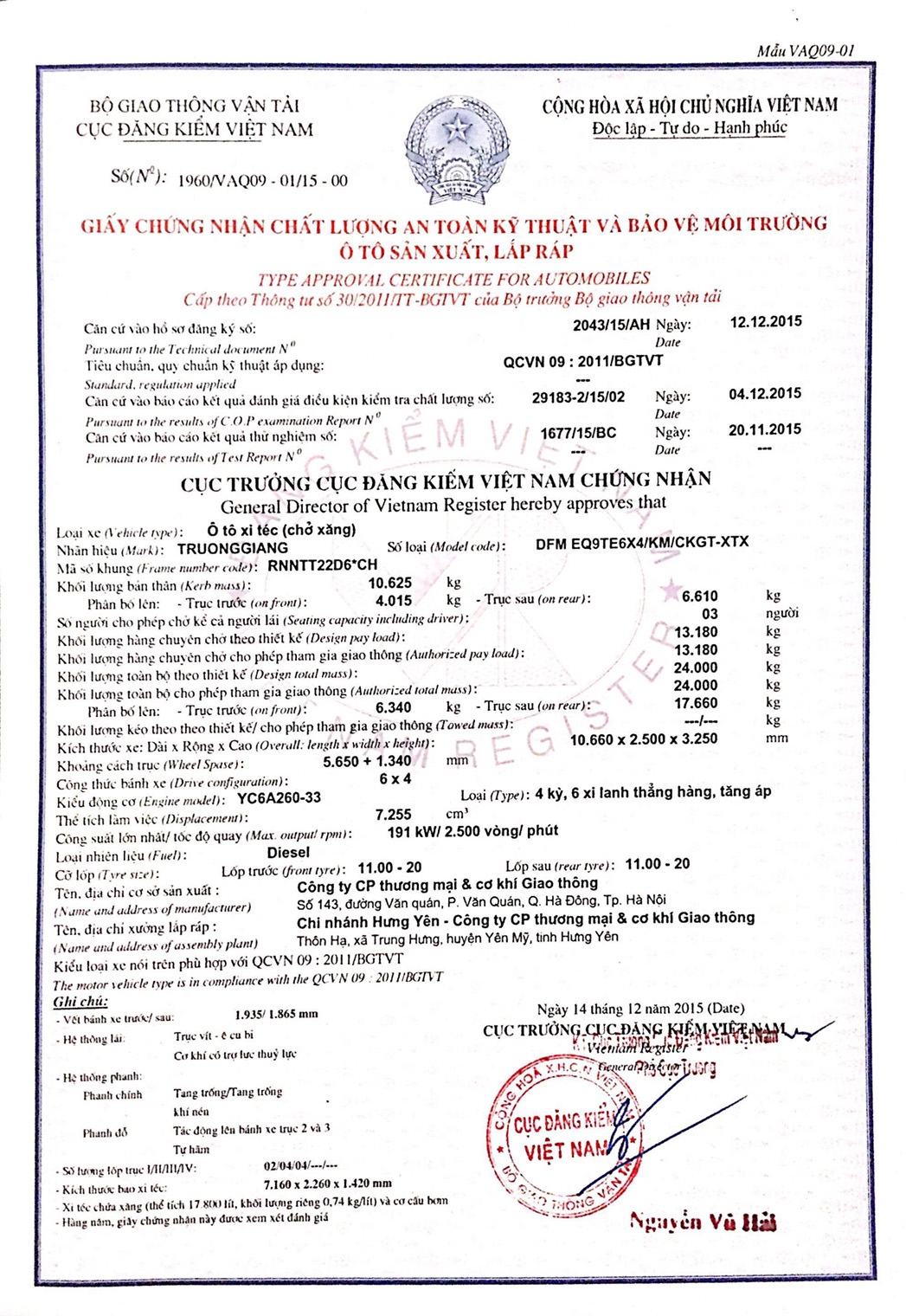 Nhãn hiệu, số loại của phương tiện |