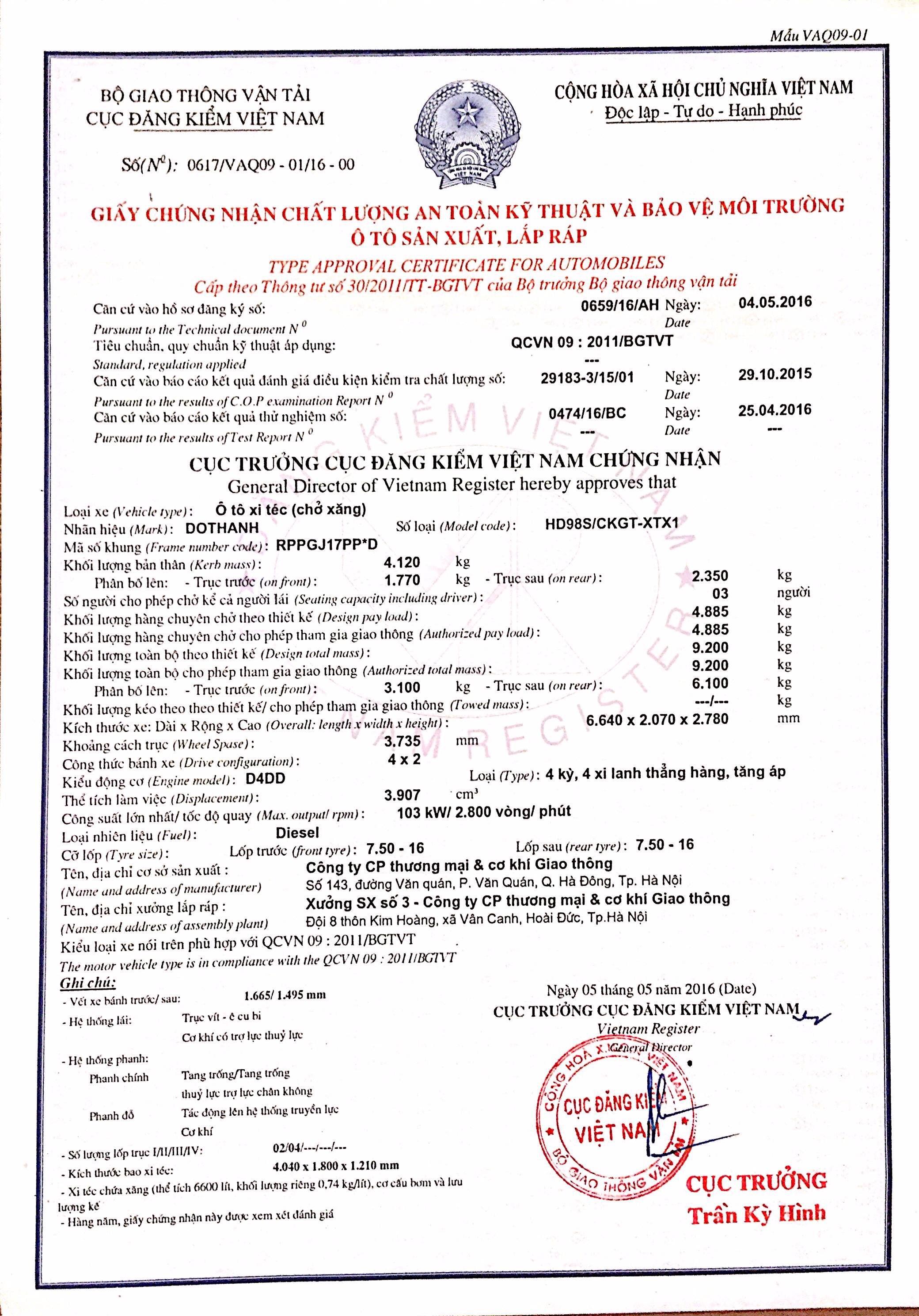 TT Nội dung Trị số 1 Thông tin chung 1.1 Loại phương tiện Ô tô xitéc(chở xăng) 1.2 Nhãn hiệu, số loại của phương tiện DOTHANH HD98S/CKGT-XTX1 1.3 Công thức bánh xe 4x2 2 Thông số về kích thước 2.1 Kích thước bao : Dài x Rộng x Cao (mm) 6640x2070x2780 2.2 Chiều dài cơ sở (mm) 3735 3 Thụng số về khối lương 3.1 Khối lượng bản thân (kG) 4120 3.2 Khối lượng hàng chuyên chở cho...