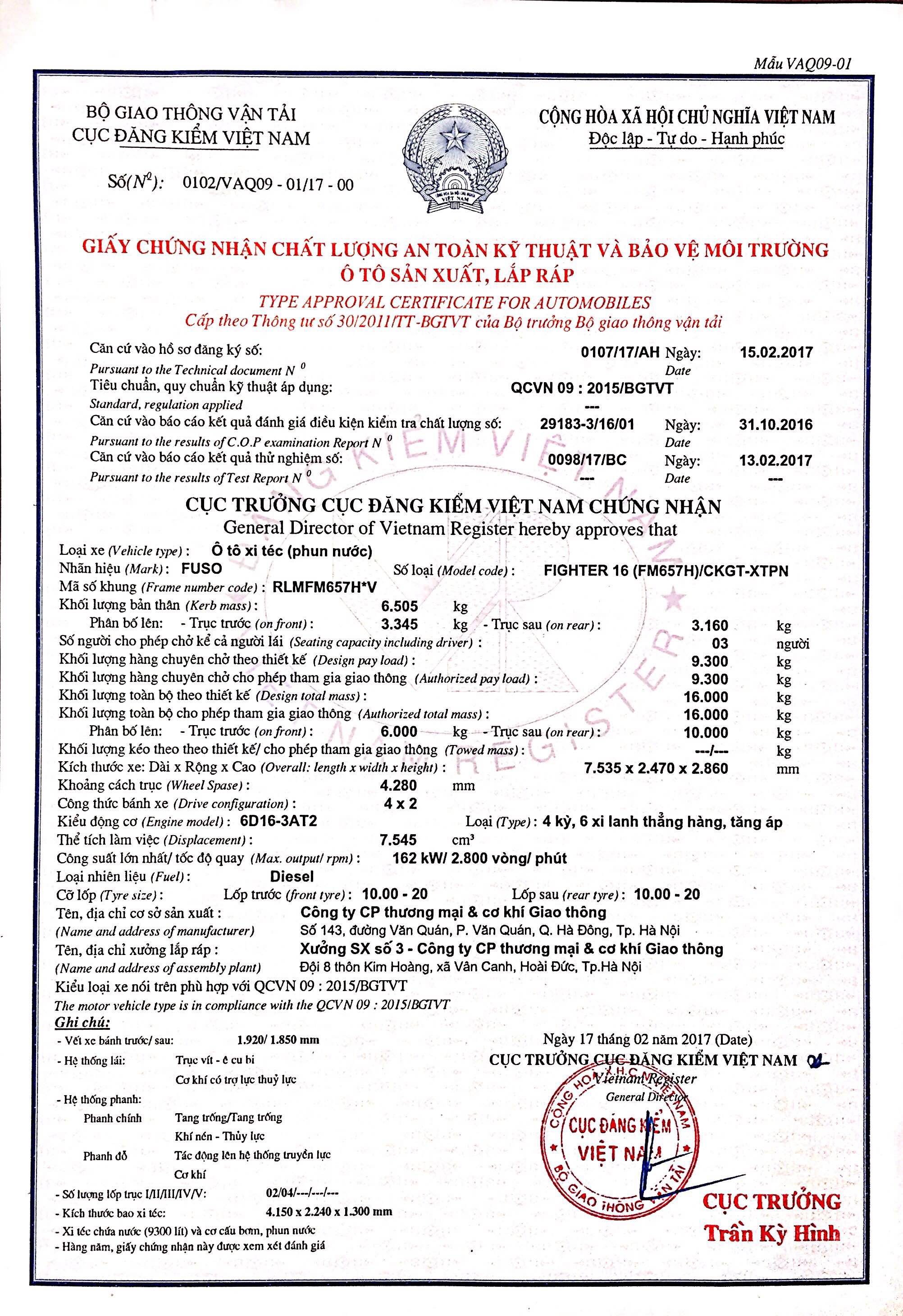 TT Nội dung Trị số 1 Thông tin chung 1.1 Loại phương tiện Ô tô xitéc (phun nước) 1.2 Nhãn hiệu, số loại của phương tiện FUSO FIGHTER 16 (FM657H)/CKGT-XTPN 1.3 Công thức bánh xe 4x2 2 Thông số về kích thước 2.1 Kích thước bao : Dài x Rộng x Cao (mm) 7535x2470x2860 2.2 Chiều dài cơ sở (mm) 4280 3 Thông số về khối lượng 3.1 Khối lượng bản thân (kg) 6505 3.2 Khối lượng hàng...