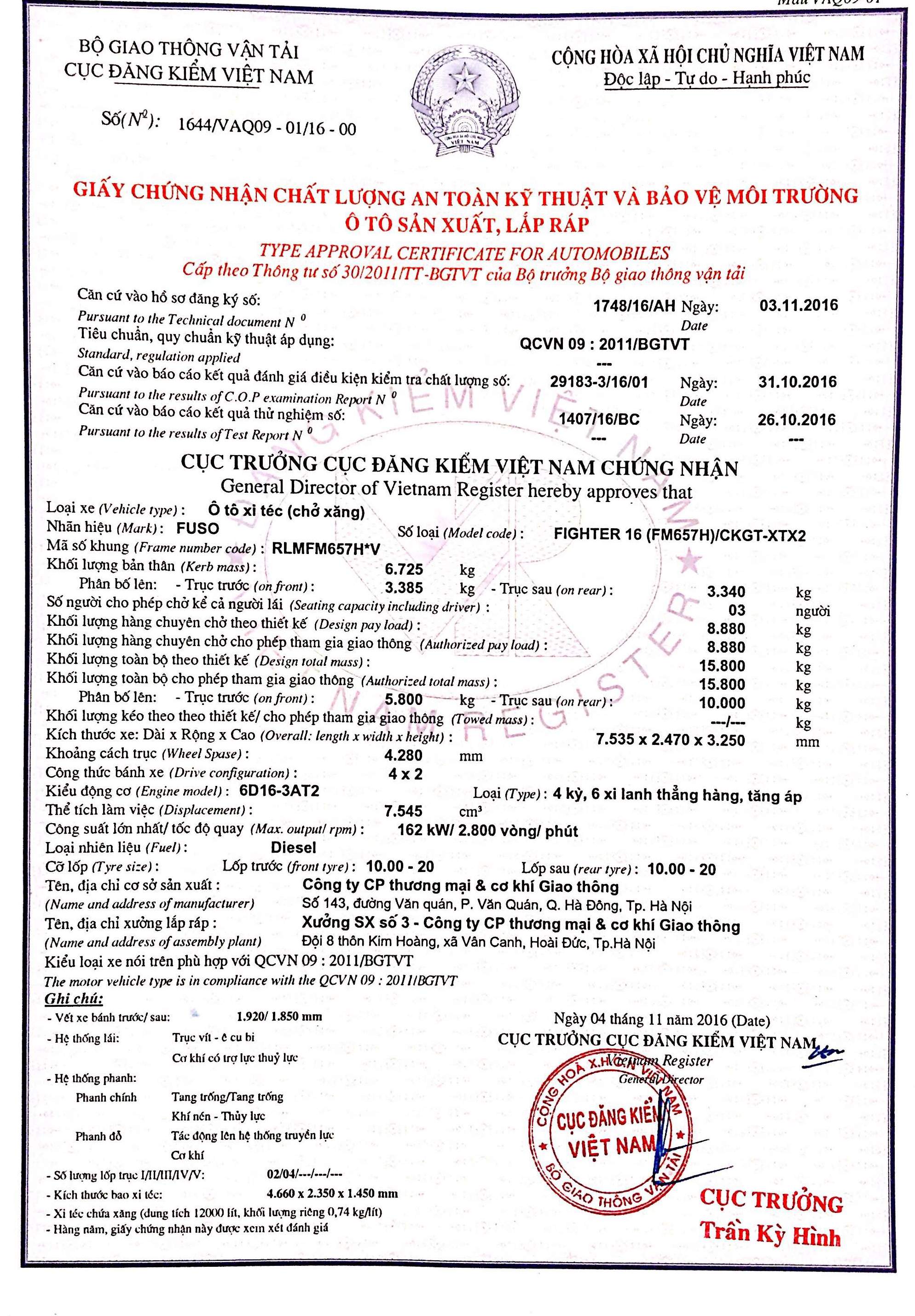 TT Nội dung Trị số 1 Thông tin chung 1.1 Loại phương tiện Ô tô xitéc (chở xăng) 1.2 Nhãn hiệu, số loại của phương tiện FUSO FIGHTER 16 (FM657H)/CKGT-XTX2 1.3 Công thức bánh xe 4x2 2 Thông số về kích thước 2.1 Kích thước bao : Dài x Rộng x Cao (mm) 7535x2470x3250 2.2 Chiều dài cơ sở (mm) 4280 3 Thông số về khối lượng 3.1 Khối lượng bản thân (kg) 6725 3.2 Khối lượng hàng...